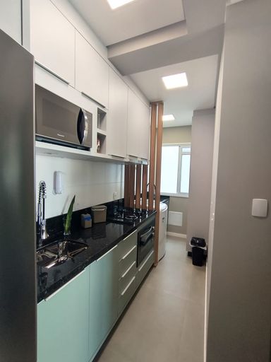 - Cozinha com armários planejados, geladeira , microondas, fogão cooktop, forno elétrico, liquidificador, cafeteira, jogo completo de louças e talheres.