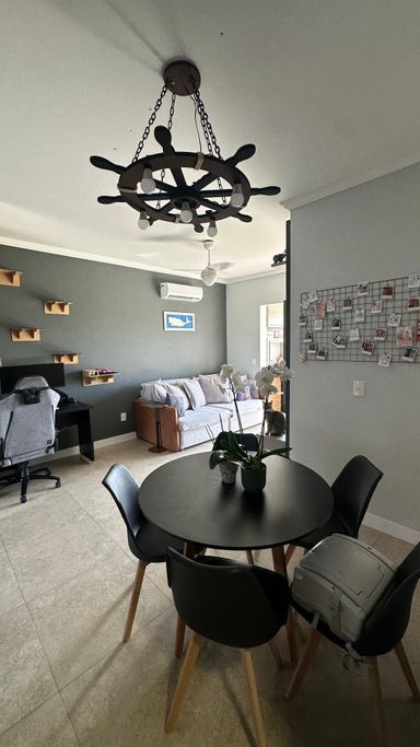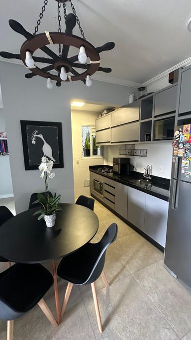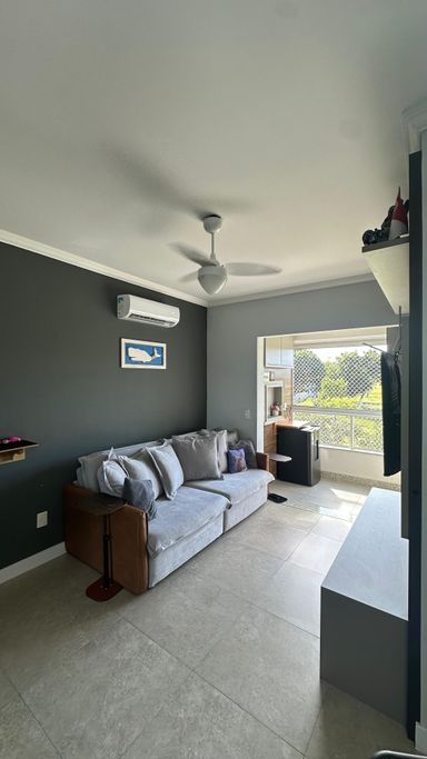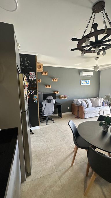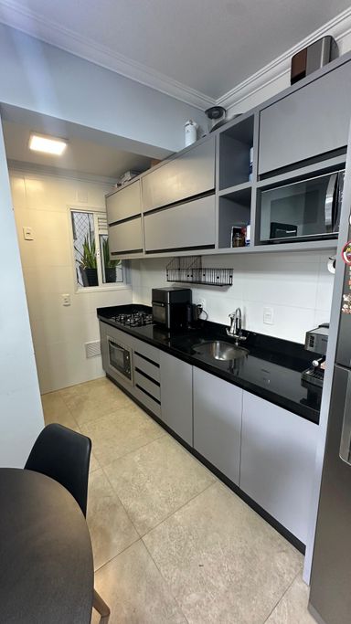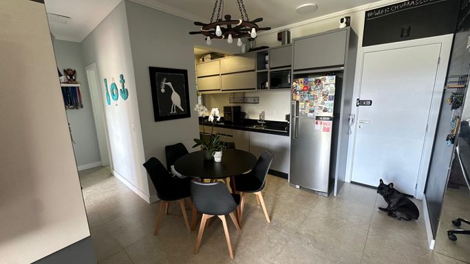 O apartamento conta com 2 dormitórios, sendo 1 suíte, sala de estar e jantar integradas, cozinha funcional, banheiro social, sacada com churrasqueir, além de área de serviço e 1 vaga de garagem. Os ambientes são bem distribuídos, arejados e com excelente posição solar Norte, garantindo iluminação natural ao longo do dia.